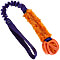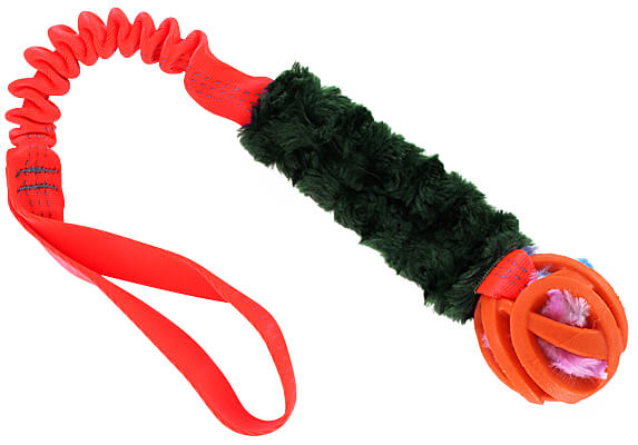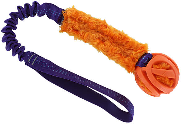The Plush Squeak THIS! Tug is approximately 22" long and offers a bunch of fun in one toy. It features a bungee handle, ombre swirl faux fur, and a 2.5"-diameter Chuckit Breathe Right Ball stuffed with plush fur.