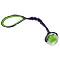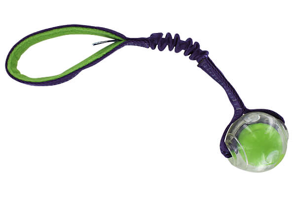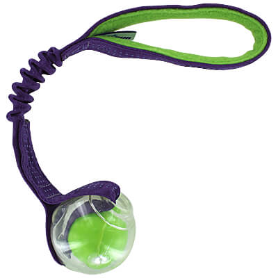 This bungee tug toy is 14" long and designed for dogs that love squeaky balls. It uses a 2.5" diameter Chase 'N Chomp Amazing Squeaker Ball. Inside the soft rubber outer ball, there's a squeaker ball with dual-squeaker technology so the toy makes different sounds depending on how the ball is squeezed.