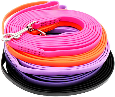 BioThane is completely waterproof and very durable. It's also non-porous so these long lines will not retain odor, and they clean easily with soap and water or a disinfectant wipe.