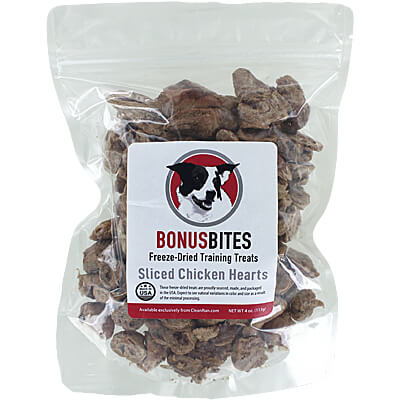 Named in memory of a very special dog that belonged to the owner of Clean Run, Bonus Bites Freeze-Dried Training Treats are 100% single protein treats. Not only are the chicken heart treats a super high-value training treat, they are excellent sources of B vitamins, iron, and essential fatty acids.