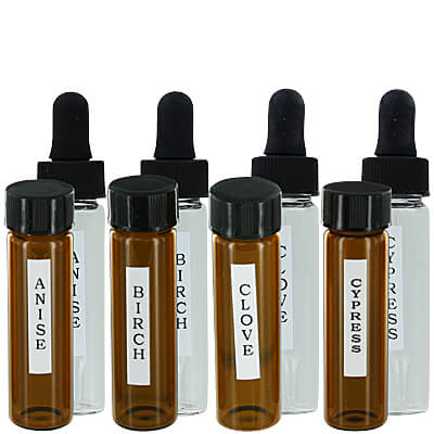 Packaging: 2 dram vial with easy open cap of Anise, Birch, Clove, and Cypress with a dropper and labeled, clear storage bottle for each oil.