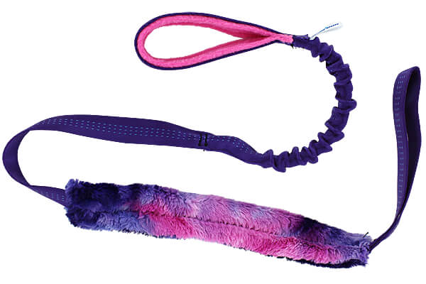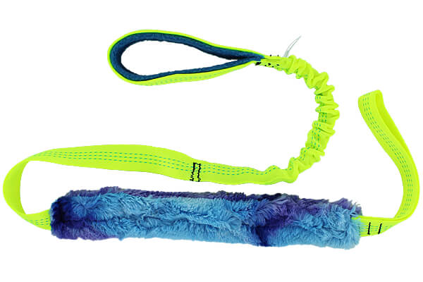 The "bungee" is made from 1"-wide nylon covering two pieces of special shock cord. It is designed to act as a shock absorber between you and the dog so there's less stress on your body while tugging, and to provide exciting resistance to the dog without you actually having to pull hard on the toy. The tension is just right for this purpose; you don't need to worry about the toy flying back at you or the dog.