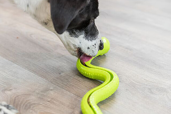 This toy is a real favorite. I have a 22 month old mini aussie who is quite the busy girl. She loves this snake. It is heavy and long enough to make it fun to lug around. I haven't even needed to put treats in it. She shakes it, squeaks it's head and chews it. You can barely even tell she has chewed on it a lot! This one is a real success! One important thing to remember is to move out of the way quickly if your dog shakes it. It hurts (but not the dog - just us people).