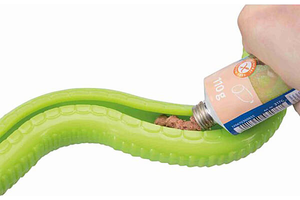 Treat Snakes are made of thick-walled thermoplastic (TPR) that is BPA-, phthalate-, and lead-free. There is a channel cut in the underside of the toy that you can stuff with treats. To clean the toy, handwash with soap and warm water.