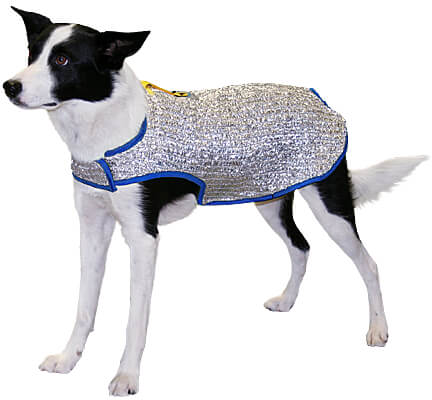 The Chillybuddy Cooling Jacket can significantly lower your dog's coat temperature and provides a shield from direct sunlight. On a 90°F day, wearing a Chillybuddy Cooling Jacket can lower your dog's coat temperature from 145°F to 103°F, a reduction of almost 30%. (This was tested with a Fluke laser infrared thermometer.) Soaking the Chillybuddy Cooling Jacket in water to dampen the cotton lining before use can lower your dog's coat temperature by a further 20°, from 103°F to 83°F. Cotton has been repeatedly shown to be the best fiber to hold water for evaporative cooling.