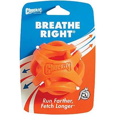 The hollow, mesh-like patent-pending design of the Chuckit Breathe Right Fetch Ball facilitates breathing and airflow into the dog's lungs while he's running and fetching. Great for playing on land and also near a pool or other body of water since it floats. The Chuckit Breathe Right Fetch Ball is lightweight and easy to grab. It is compatible for use with Chuckit launchers.