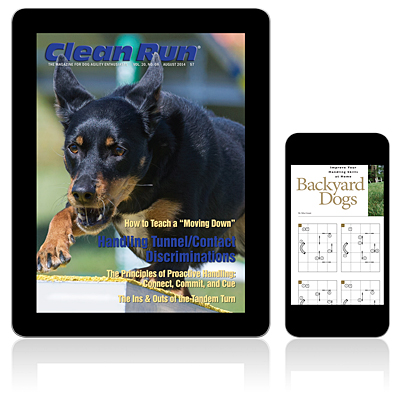 A few of the features: Mary Ellen Barry explains the tandem turn, Janita Leinonen and Jaakko Suoknuuti of Finland discuss the importance of the three Cs (connect, commit, cue), Amanda Shyne presents exercises for teaching your dog a moving down, Nancy Gyes discusses training contact/tunnel obstacle discriminations, Ace Russell shares his 4x4 weave pole training program, Jenni Shelegy looks at turning dogs tightly out of tunnels and chutes, Daisy Peel shares exercises to help you handle your dog around the obstacles without taking them, Dr. Sherman O. Canapp and Dr. Brittany Jean Carr discuss regenerative medicine for softy tissue injuries in agility dogs, Jan Manning continues her series on agility clubs, Kathy Keats continues her series on perfect timing, Sally Silverman interview Kathrine McAleese who works with handlers to eliminate their mental gremlins, and Carol Lynn Evans breaks down an AKC Excellent Standard course, and more! 68 pages.