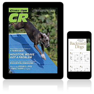A few of the features: Megan Foster examines common weave pole problems and how to work through them; Sandy Rogers explains how to identify your strengths and weaknesses as a trainer; Cynthia Hornor shares exercises for getting your dog to drive ahead and improving rear cross timing; Holly Krueger discusses selecting a puppy for agility; Nancy Gyes provides challenging drills that are appropriate for different levels; Jo Sermon shares sequences for starting to sequence with backsides; Annie Pyle dives into the game of Snooker; John Reid shares sequences for small spaces, Lisa Schmit explains what factors to consider when deciding whether to retire your dog from agility; exercises to work on obstacle focus skills, and more. 56 pages.