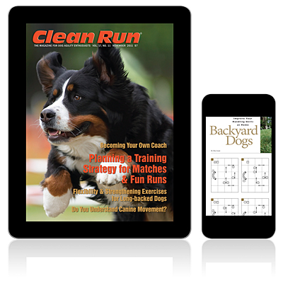 A few of the features: Rachel Sanders discusses how to use matches and fun runs effectively for training, Dr. Bill Orstrom helps us understand canine movement, Dr. Deborah Gross Saunders provides exercises for dogs with long backs, Eva Bertilsson and Emelie Johnson Vegh suggest ways for you to become your own agility coach, Frankie Joiris show us how to teach peanut racing to our dogs to help with their coordination and body awareness, Lori Gwyr gives us some things to try to motivate the "un-motivatable" dog, Deborah Jones shares lesson plans for week 7 of a FOCUS and impulse-control class, Nancy Gyes provides exercises for working on gnarly rear crosses and tight front crosses close to possible off-course obstacles, Jamie McKay explains the importance of setting goals, Stuart Mah presents exercises to help you control how the dog comes out of tunnels and moves to other obstacles, and much more! 68 pages.