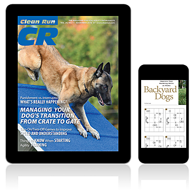 A few of the features: We've all heard people telling their dogs "no," but Eileen Anderson discusses whether it's punishment ro we are just interrupting a behavior; Nancy Gyes explains how to use two-on/two-off games to build up your dog's understanding and speed; Claire Duder looks at the importance of a good transition from your crate to the ring gate and how it can impact your run; Jamie McKay provides a not-so-beginner guide of things you need to know when you're been training dogs but are just coming to agility; Jo Sermon works on creating independent contact and weave performances with her youngsters; Justine Davenport explains her handling system and its goals; Sandy Rogers continues her series on how to maintain your two-on/two-off contact performance; John Reid shares drills that fit in a 60ft. x 40ft. training space and provide opportunities to work on serpentines, 180s, and pull-throughs; Mia Grant shares exercises to work on recall to heel skills with momentum; Dudley Shumate puts up "super sets" for training multiple dogs; and more. 52 pages.