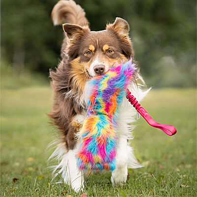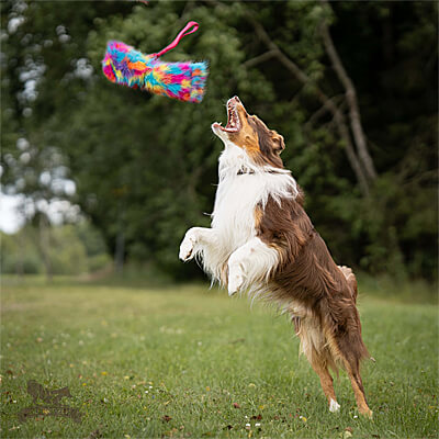 It's made of thick high-quality faux fur that dogs love. A layer of crinkle material is hidden between the fabric layers so that the toy crinkles every time your dog grabs it. In addition, there's a seam sewn in the middle of the toy which makes it flop really well when the dog shakes it.