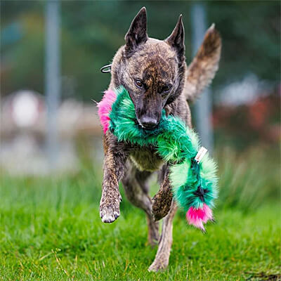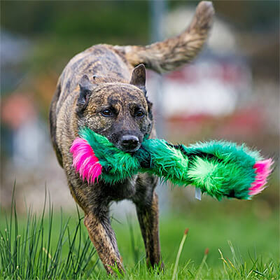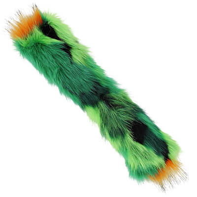 This super thick and plush green faux fur toy will instantly become a favorite. We haven't fully figured out exactly what is so enticing about this toy, but the dogs love the "feel" of it in their mouths. Many also get excited by the sound it makes when they grab it—the toy has a layer of crinkle material between the fabric layers.