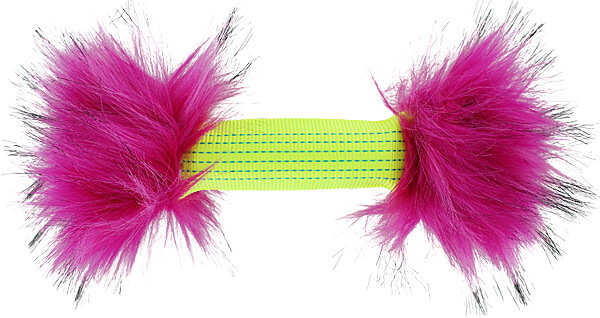 The Squeaker Cracker looks like a typical tug stick toy, but hidden inside the tube is a 4.5" long squeaker. On either side of the squeaker tube are pieces of thick luxury faux fur in mixed colors.