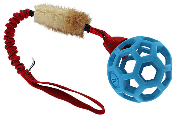 But this isn't just a tug toy. It's also a Bungee Handle that you can use to make your own toys! Simply loop one handle of the tug through a toy (a ring, a Hol-ee Roller Ball, or anything else the nylon webbing can be pulled through) and then loop it through the other handle. You now have a 23"-long bungee handle for your toy.