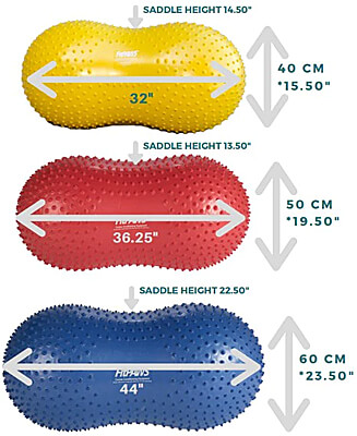 The maximum inflation size of the 60cm peanut is 23.5" high by 44" long, but the recommended inflation is 95% or 23". You can decrease the amount of air in the peanut to increase the balancing challenge, but do not overinflate!
