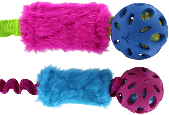 The Floramicato Fluffy Crackle Ball Tug features a bungee section to create exciting resistance, a faux fur bite pillow, and a Crackle Head Ball. The Crackle Head Ball consists of a flexible, round rubber "cage" covering a "bottle ball," which is a hollow ball made from recycled bottles. When your dog bites down on this ball, it makes a sound that many dogs love.