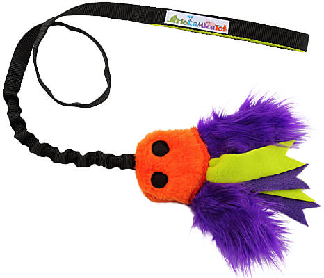 The small Floramicato Fluffy Jelly Fish Tug is a cute and quirky toy that dogs love to chase and tug with. There's a squeaker inside the head of the toy and tantalizing fluffy legs. The long bungee handle is padded for comfort and allows the toy to be dragged on the ground to simulate prey. It's made from 3/4" thick nylon.