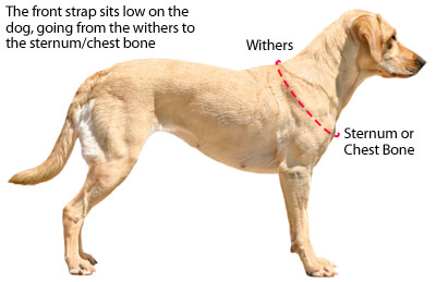 The Haqihana Harness is designed to sit low on the front of the dog so that the front ring is on the dog's sternum/chest bone and the front end of the top strap is at the dog's withers. There should be at least 2" (5cm) of space between the dog's armpits and the harness. If there is less than this, then you need the long version of the harness in your size; for example, MD-Long instead of MD.