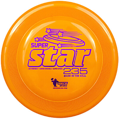 The Hero SuperStar 235 is an opaque durable, bite-resistant disc made from some of Hero Disc's most resilient plastic. It is one of the most stable and predictable dog discs available, and it still has some float so dogs have time to get to it. It cuts through the wind nicely and keeps its flexibility in cold conditions.