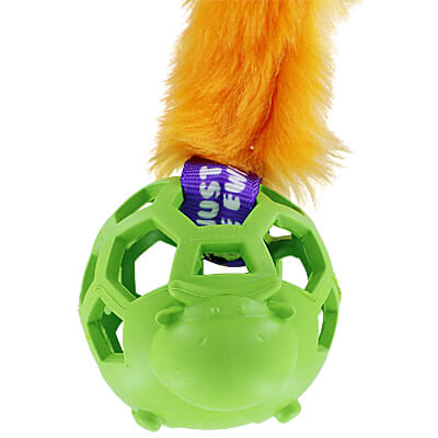 The Just Be Ewe Bungee Tug is made with custom webbing that we designed here at Clean Run. The tug is 23" long from top to bottom. It features orange faux fur, a 3-1/4" diameter Hol-ee Cow Ball made from 100% natural rubber that is certified nontoxic by an independent testing lab, and a handle padded with high-quality, nonpilling fleece for your comfort.