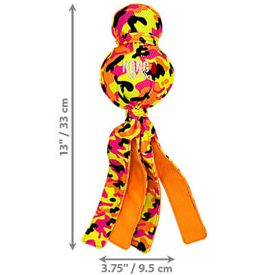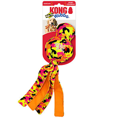 The Kong High Viz Wubba is specially designed with bright, high visibility colors for various environments, weather, and terrain. This toy is perfect for training, fetching, tugging, and playing. A durable reinforced ballistic nylon exterior combines with unique ball shapes for play sessions that last longer. A squeaking body and long, durable tails add to the fun for shaking and trashing back and forth, making every play session exciting, whether solo or interactive, indoor or outdoor.