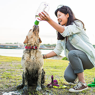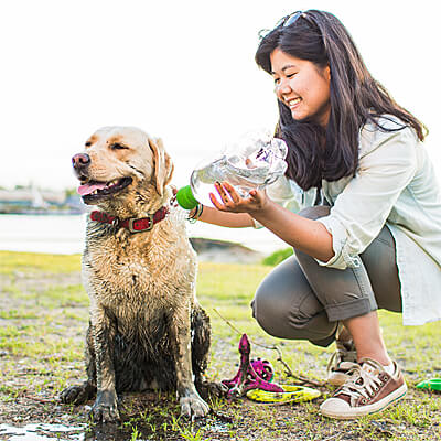 Turn any plastic soda bottle into a portable shower and then use it to clean off your dog or muddy gear, wet down your dog if he's hot, or even give your dog a drink of water.