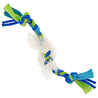 Made just for puppies and small dogs, the Mini Braided Bunny Tug features narrow strips of soft fleece braided together with 3/8" nylon cord (for strength and durability) and 3" of real bunny fur. This tug is approximately 11" long and has a knot on each end to make it easy for both you and the dog to grip.