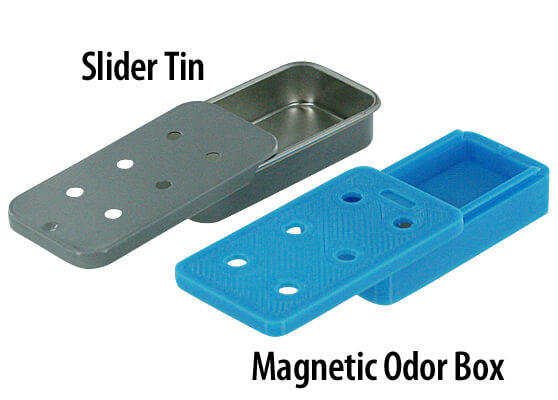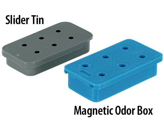 Throw out the rusty nose work slider tins you've been using for hides and switch to our Magnetic Odor Box with a sliding top that snaps into place and an optional engraved odor identifier.
