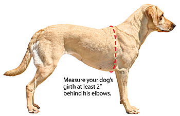 Using a flexible measuring tape, measure snugly about 2" behind your dog’s front legs all the way around him. You are measuring the circumference of his body, the girth, like measuring a person for a belt. Be sure that your dog is standing squarely.