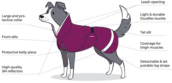 Designed by Pomppa Oy in Finland, this stylish and excellently made dog coat protects the dog's back, neck, abdomen, and rear end without restricting their natural movement. The front slits allow the dog to move his front legs without restriction. The large collar opening allows the dog to move his head freely. The snug-fitting belt holds the coat in place, and the curved buckle conforms to the dog's back. The dog can also wag and carry their tail freely due to the tail slit at the back. Reflectors ensure your dog is seen in low-light conditions.