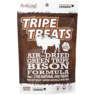 PetKind Green Tripe Bison Formula treats include the benefits of green tripe in a convenient to feed and friendly smelling format. These moist training treats come in thin, perforated strips that are 7/8" high by 5" wide and are easy to break into training-size pieces.