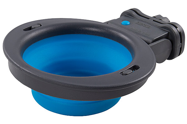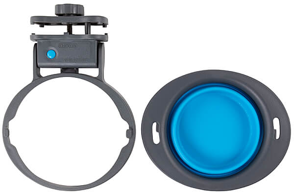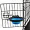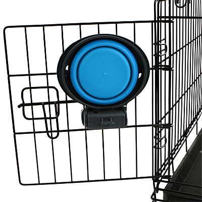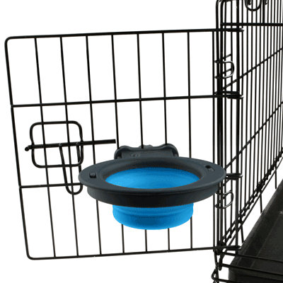 These collapsible/expandable food and water Kennel Bowls are really convenient. Attach the bracket that holds the bowl to a wire crate door or to a kennel wall. Insert the collapsible/expandable bowl and twist it a quarter turn to lock the bowl in place; this prevents the dog from knocking the bowl out of the holder and spilling anything. Pop out the bowl to expand it when you're ready to give your dog food or water. When you're done, collapse the bowl and then press the release button that allows you to flip up the bowl holder so your dog has all his crate or kennel space back. Collapse the Popware Kennel Bowl and put it in the dishwasher for a thorough cleaning. The bowl is 6" in diameter, 2" deep when open, and it holds 1 cup (8 oz.). It collapses to 5/8" high.