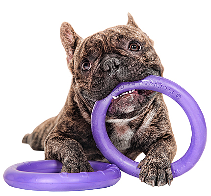The Puller is made out of a unique proprietary material (not rubber) that is safe, nontoxic, scentless, lightweight, durable, strong, and does not damage or wear down your dog’s teeth and gums. The resilient material actually lets your dog’s teeth sink deep inside it, without the toy losing its shape and strength. Dogs love the gentle squishy feeling when they chomp down on the ring and we've found this toy quickly becomes a favorite.