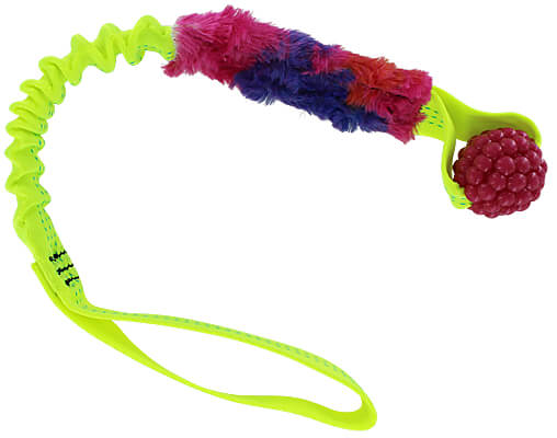 The Raspberry Rainbow Bungee Tug is made with bright multicolor faux fur, a bungee handle, and a Orbee-Tuff Raspberry ball. This is a great tug toy for small dogs because the Rasberry ball is easy for them to grip. It's also a great toy for larger dogs if you want a toy you can easily hide.