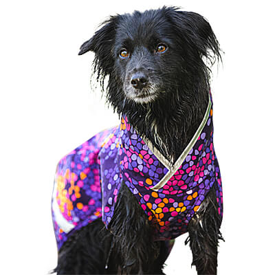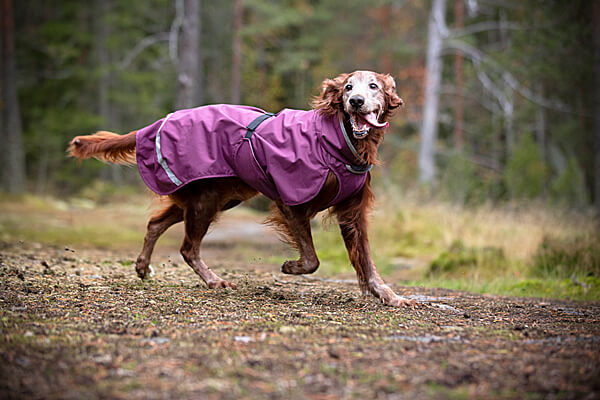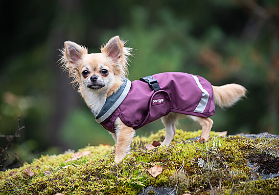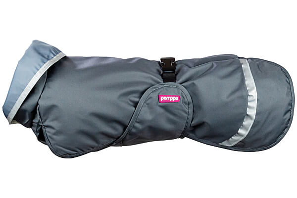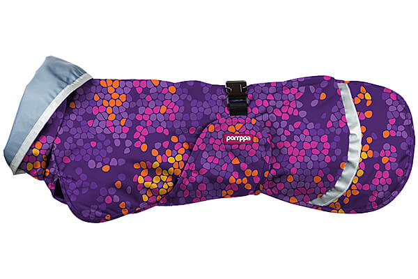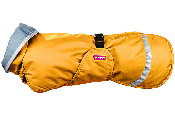 Pronounced "shaa' day," which means "rain" in Finnish, the Sade Pomppa is a dog raincoat for year-round use. The waterproof and durable shell fabric protects the dog from rain, wind, and dirt. The lining is made of smooth anti-static material which repels dog hair and debris. The thin, non-insulated raincoat works as an all-purpose coat for dogs with thick fur. For cold-sensitive dogs, the Sade Pomppa works better as a raincoat for warmer weather (if you also need a raincoat for cold weather, look at the Kevyt Pomppa).