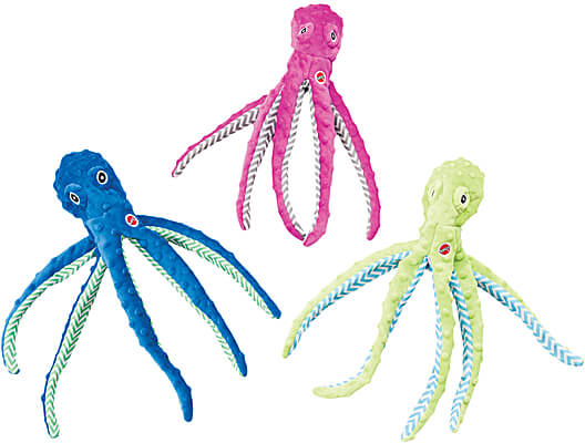 The stuffing-free Skinneeez Extreme Octopus features a rip-stop mesh lining for extra strength and is reinforced with two layers for extra durability. 16" long and contains a single squeaker.