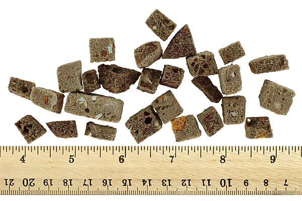 Do you cut up fresh dog food rolls for training treats but are tired of greasy fingers? Chicken Cosmic Crunchers are for you! This delicious treat is cut into manageable pieces and freeze dried. The treats can be fed as is or reconstituted with water for a softer texture. We like these because they maintain their shape, are not greasy, and are easy to toss for training.