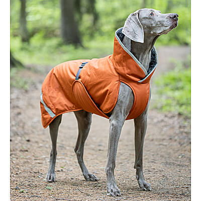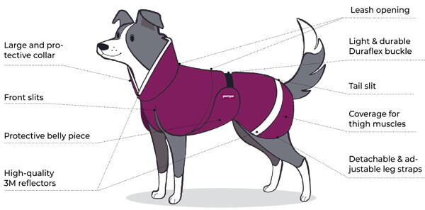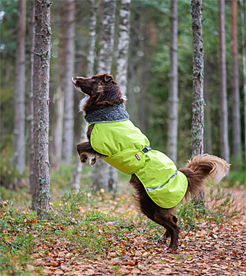 Designed by Pomppa Oy in Finland, this stylish and excellently made dog coat protects the dog's back, neck, abdomen, and rear end without restricting their natural movement. The front slits allow the dog to move his front legs without restriction. The large collar opening allows the dog to move his head freely. The snug-fitting belt holds the coat in place and the curved buckle conforms to the dog's back. The dog can also wag and carry their tail freely due to the tail slit at the back. Reflectors ensure your dog is seen in low-light conditions.