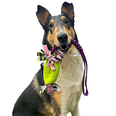This version of the Treat Hugger has a 14"-long bungee handle so that you can start introducing some resistance and tugging to your food-loving dog. It has the same fleece fringes as the Fleece Treat Hugger, and we have made it fantastically fun by using patterned nylon for the main body of the toy. The treat area is 4" long, 2-1/2" wide, and 1-1/2" high so it's a little smaller than the Fleece Treat Hugger.