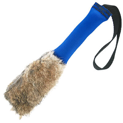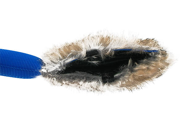 The TugAway Tug Stick with Reward Pouch is handmade in Wisconsin. This toy combines the benefits of a soft tug stick (like a Riot Stick or a Dynamite Stick) with the fun and motivation of a rabbit fur reward pouch. Dogs are stimulated by the scent of the fur and when treats are added to the pouch, they quickly learn that the toy also provides a food reward. Besides being a great tug stick, the toy is well-balanced and throws very accurately.