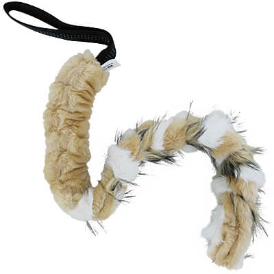 The total length of the toy is 32". This fantastic tug toy has great "movement" when you wiggle it around, which gets dogs excited and wanting to chase it. It has great grippability for dogs and the soft, fuzzy textures will appeal even to soft-mouthed dogs. It's also a good toy to drag along the ground and entice play from puppies.