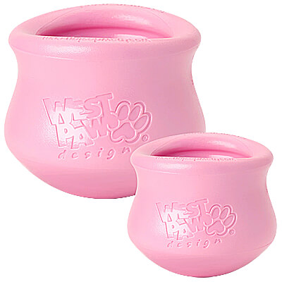 is designed to be filled with a dog's favorite kibble or treats. The Toppl's soft, rounded inner "teeth" contain a contoured cavity to hold treats in place until your dog nudges them out. To change up the challenge, simply connect the Large and Small together.