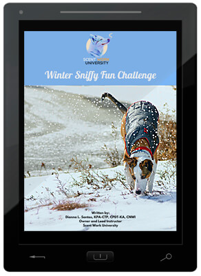 While it is true that scent work is done in all sorts of weather, it can be difficult to come up with the inspiration to do so in the dead of winter. Never fear, the Winter Sniffy Fun Challenge E-Book is here!